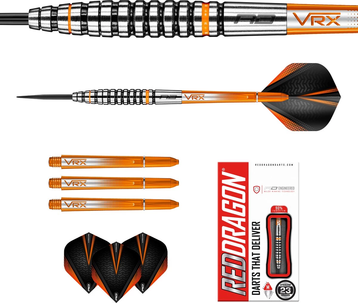 Jeu de 23 grammes – fléchettes professionnelles 90% tungstène. Le jeu de fléchettes est livré avec des fléchettes Nitrotech et des fléchettes RED DRAGON Hardcore extra épaisses.