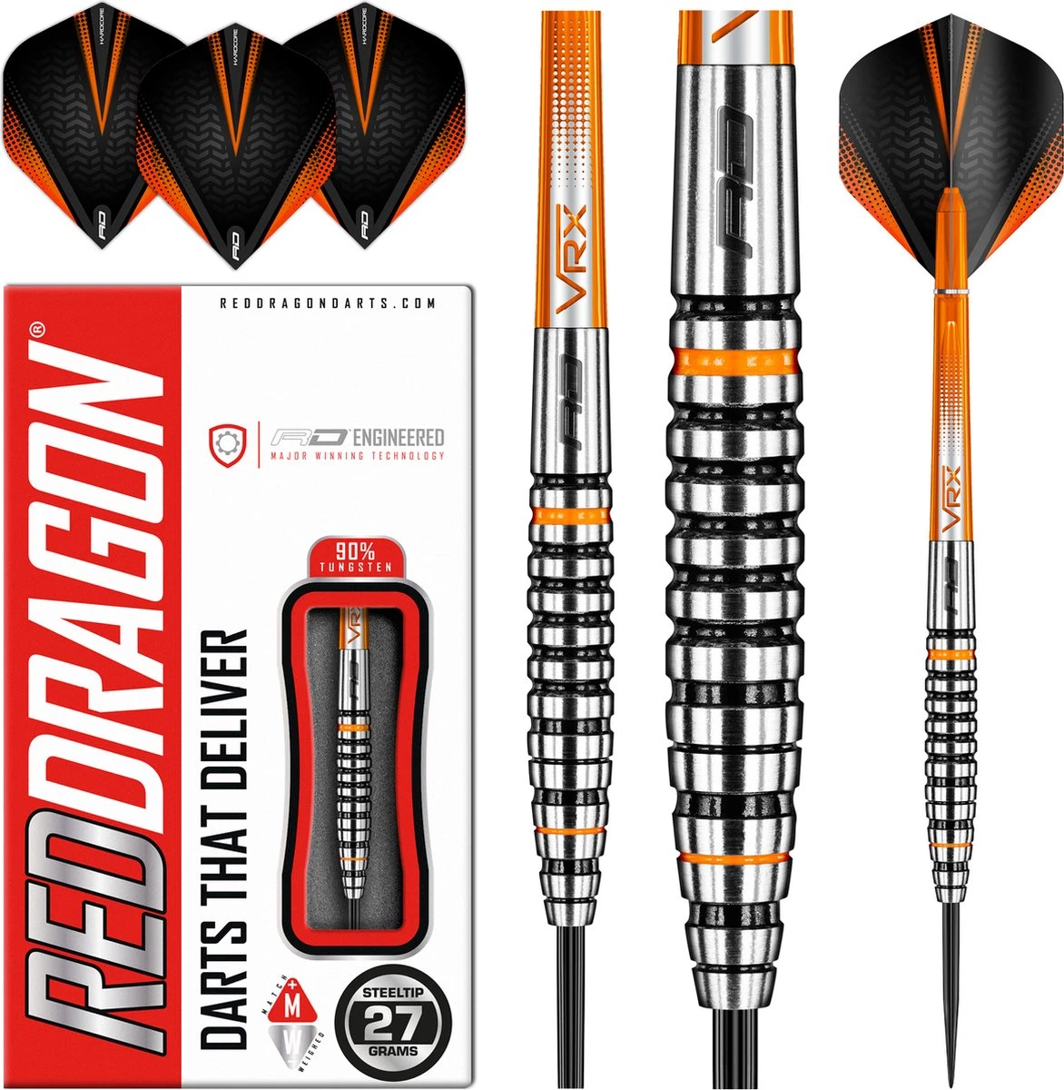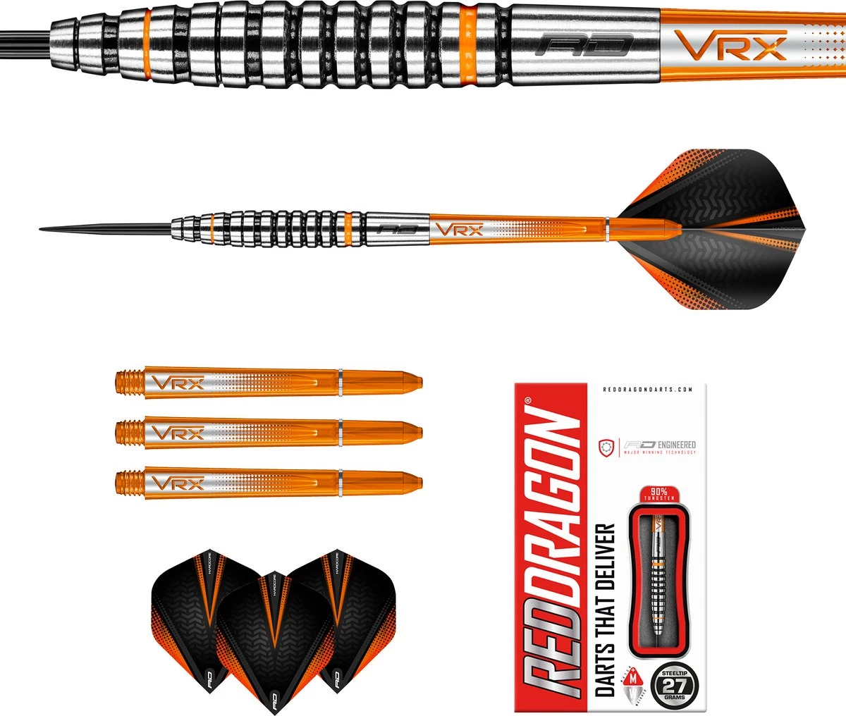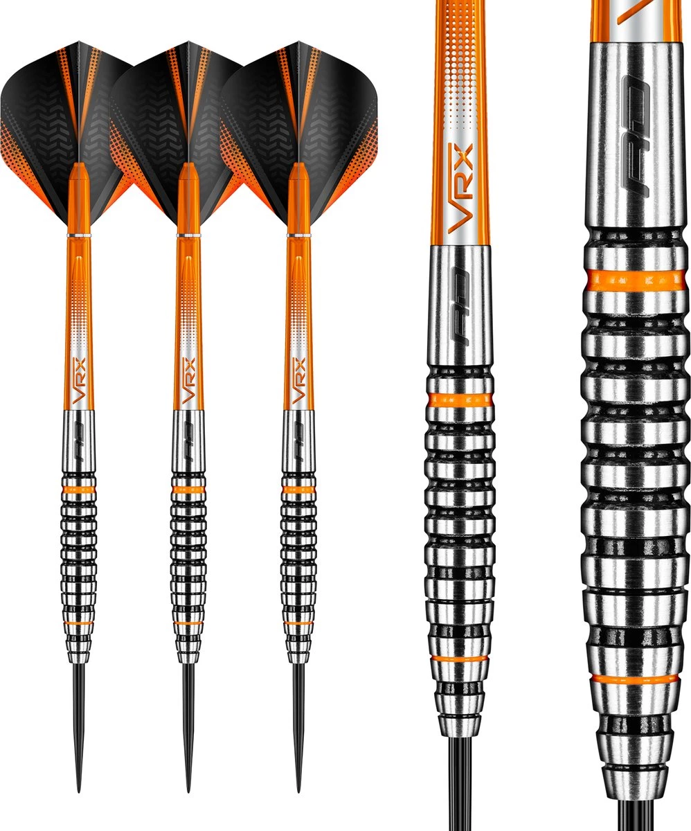 Set 27 grammes – Fléchettes professionnelles 90% Tungsten Steeltip. Set de fléchettes est livré avec des arbres de fléchettes Nitrotech. Fléchettes red DRAGON Hardcore Extra épais.Les vestes ambrées se distinguent par leur style distinctif noir et orange. Les crics orange sont également disponibles en poids de 21, 22, 23, 24, 25, 26, 27, 28 ou 30 grammes