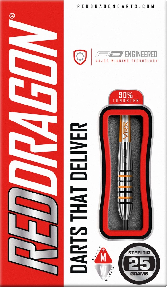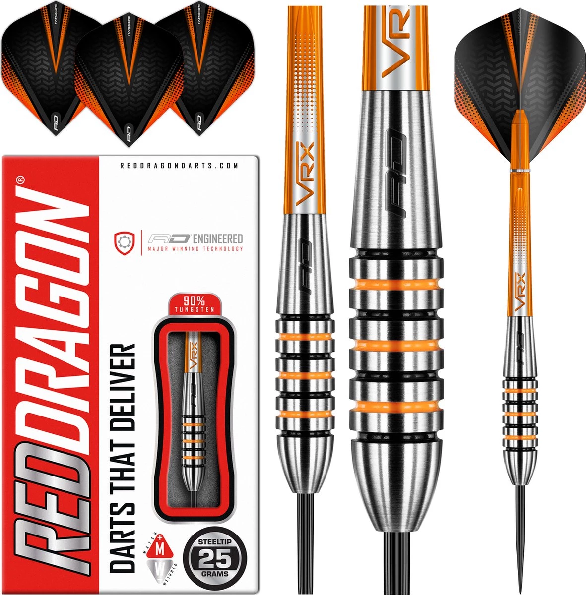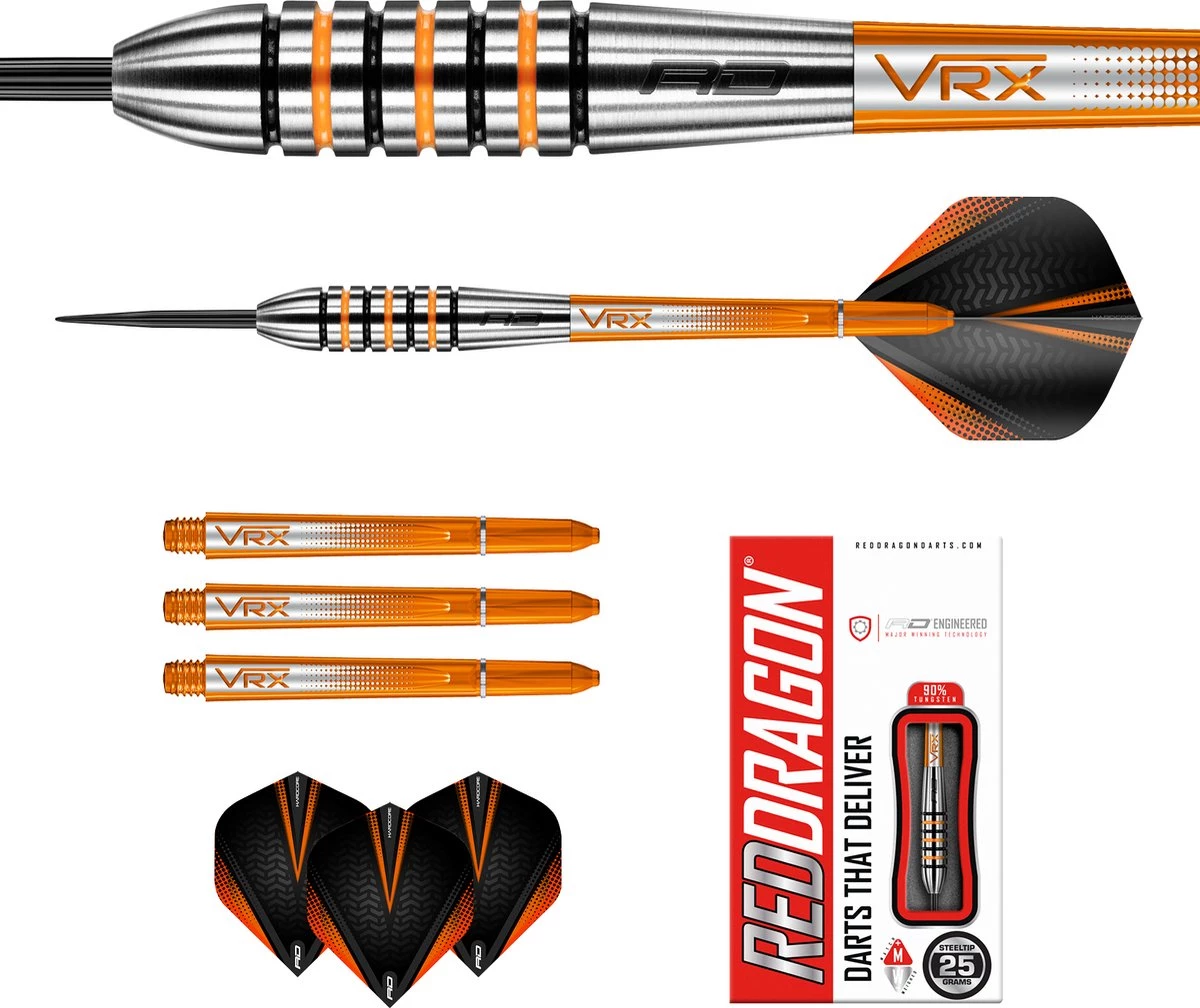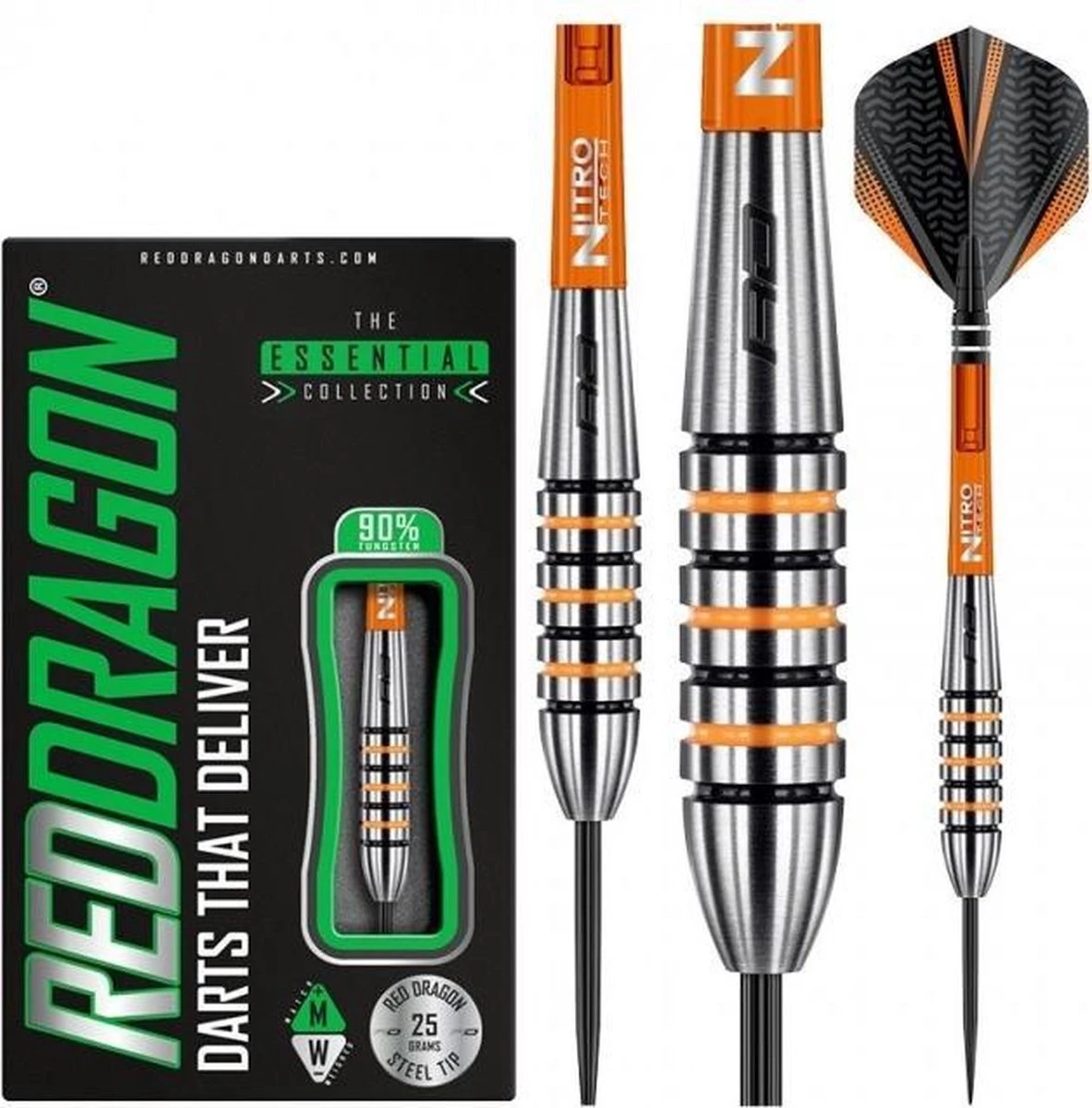 Set 25 grammes – fléchettes professionnelles 90% tungstène. Le jeu de fléchettes est livré avec des fléchettes Nitrotech et des fléchettes RED DRAGON Hardcore extra épaisses.
