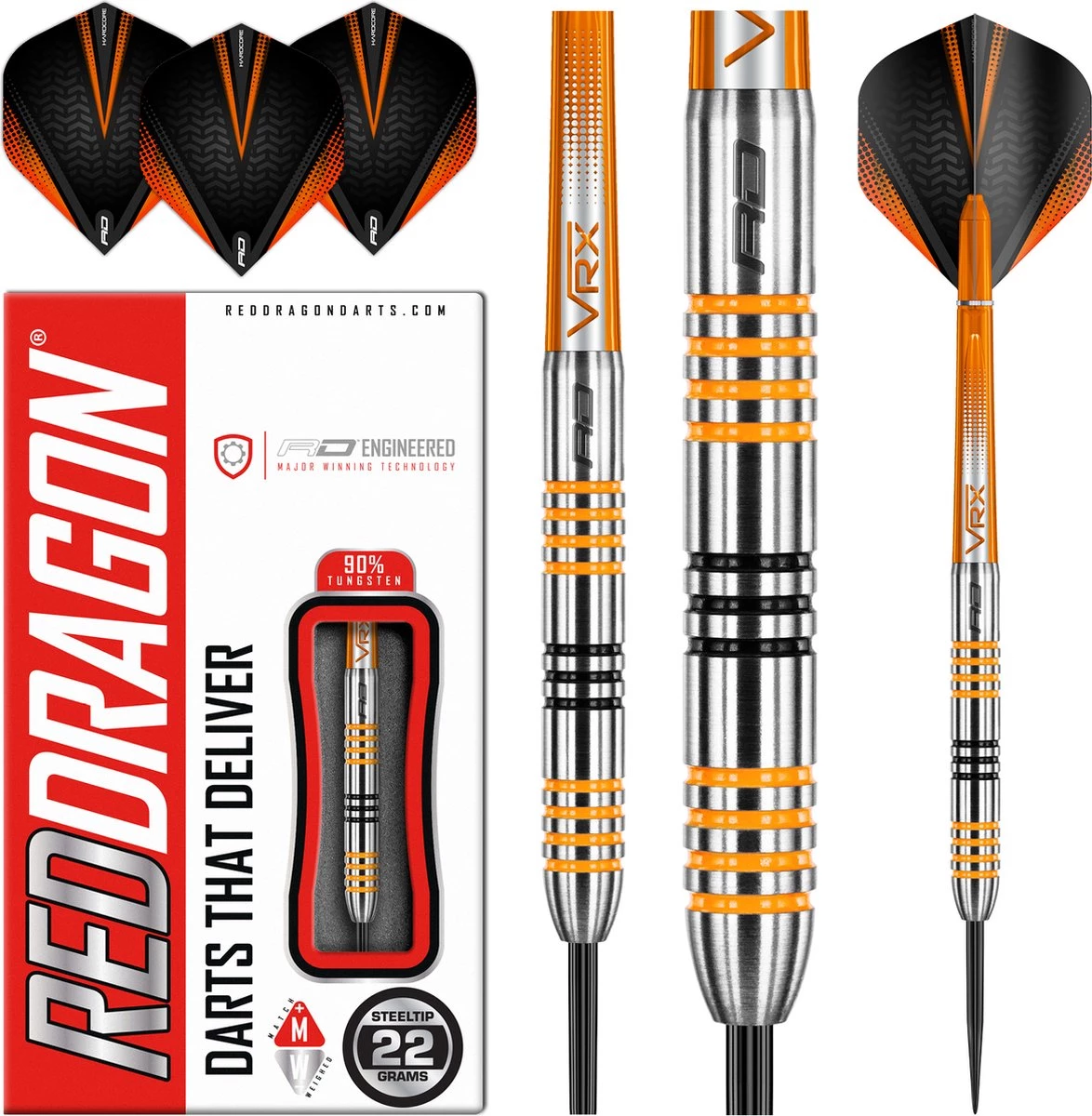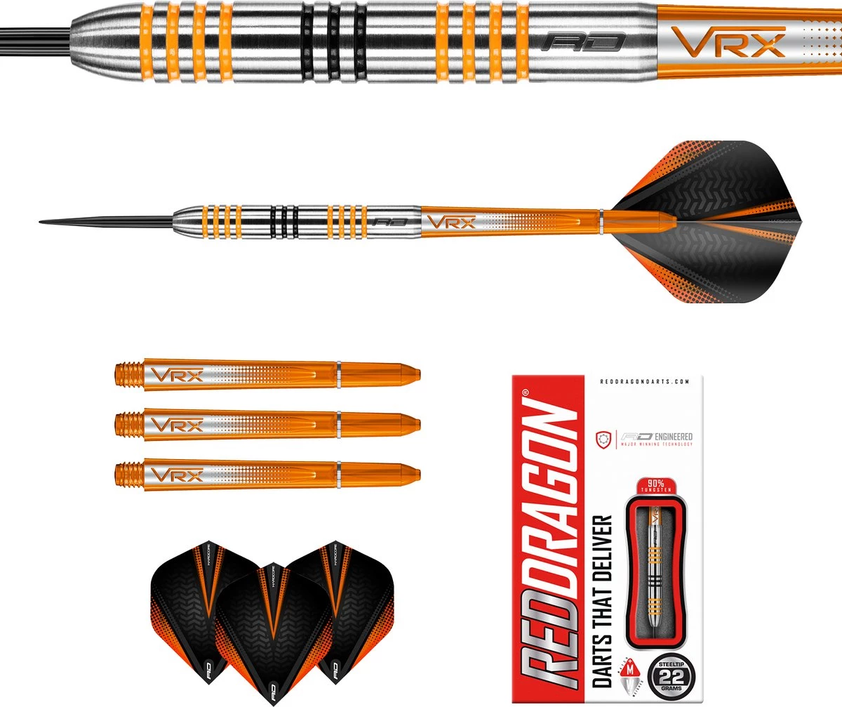 Set de 22 grammes – Fléchettes professionnelles 90% Tungsten Steeltip. Set de fléchettes est livré avec des arbres de fléchettes Nitrotech. Fléchettes red DRAGON Hardcore Extra épais.Les vestes ambrées se distinguent par leur style distinctif noir et orange. Les crics orange sont également disponibles en poids de 21, 22, 23, 24, 25, 26, 27, 28 ou 30 grammes