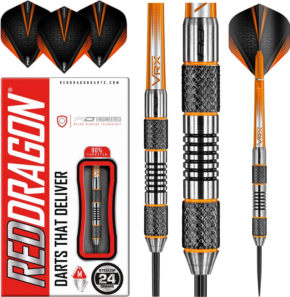 Set 24 grammes – Fléchettes professionnelles 90% Tungsten Steeltip. Set de fléchettes est livré avec des arbres de fléchettes Nitrotech. Fléchettes red DRAGON Hardcore Extra épais.Les vestes ambrées se distinguent par leur style distinctif noir et orange. Les crics orange sont également disponibles en poids de 21, 22, 23, 24, 25, 26, 27, 28 ou 30 grammes