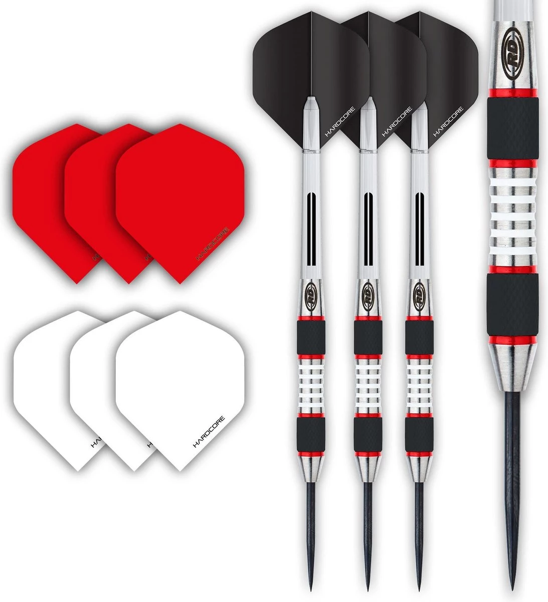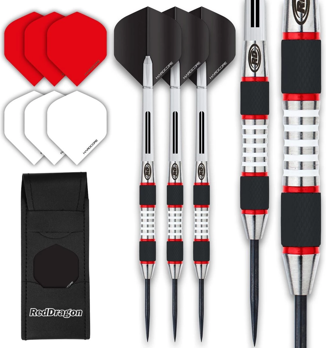 Set de 26 grammes – Set de 3 fléchettes en tungstène de qualité supérieure Red Dragon . Le Set de fléchettes est livré avec des fléchettes en nylon Ring Grip, 3 jeux de fléchettes RED DRAGON Hardcore extra épais. Red Dragon .Ces flèches de coupe usinées avec précision ont une excellente adhérence le long de leurs barillets élégants et profilés.Disponible en poids de 24g, 26g, 28g.