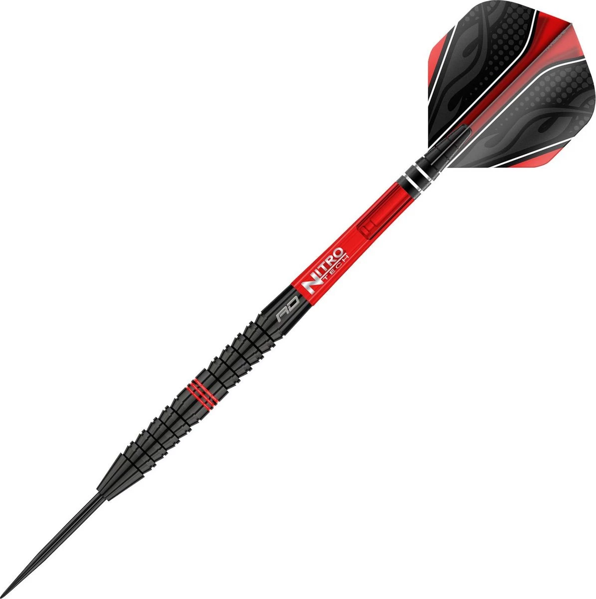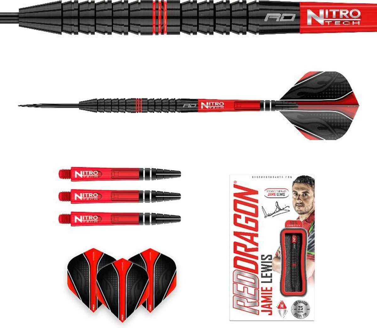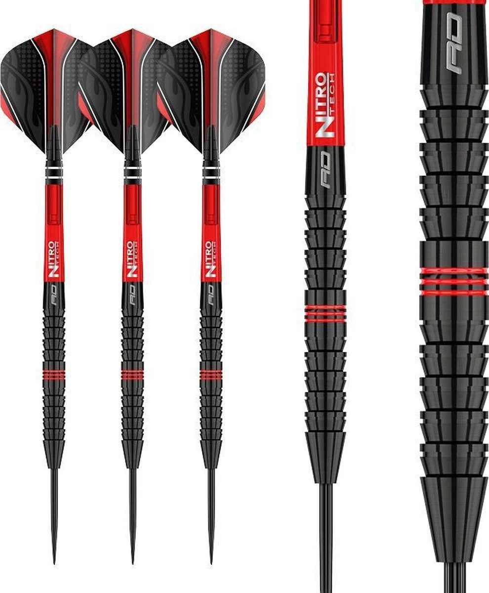 Set 25 grammes – fléchettes professionnelles 90% tungstène. Le jeu de fléchettes est livré avec des fléchettes Nitrotech et des fléchettes RED DRAGON Hardcore extra épaisses.