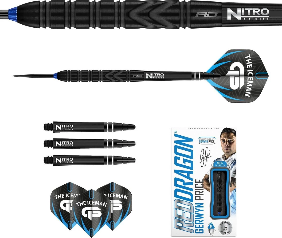 Jeu de 24 grammes – flĂ©chettes professionnelles 90% tungstène. Le jeu de flĂ©chettes est livrĂ© avec des tiges de flĂ©chettes Nitrotech, des flĂ©chettes RED DRAGON Iceman Hardcore très Ă©paisses et des points de flĂ©chettes Trident