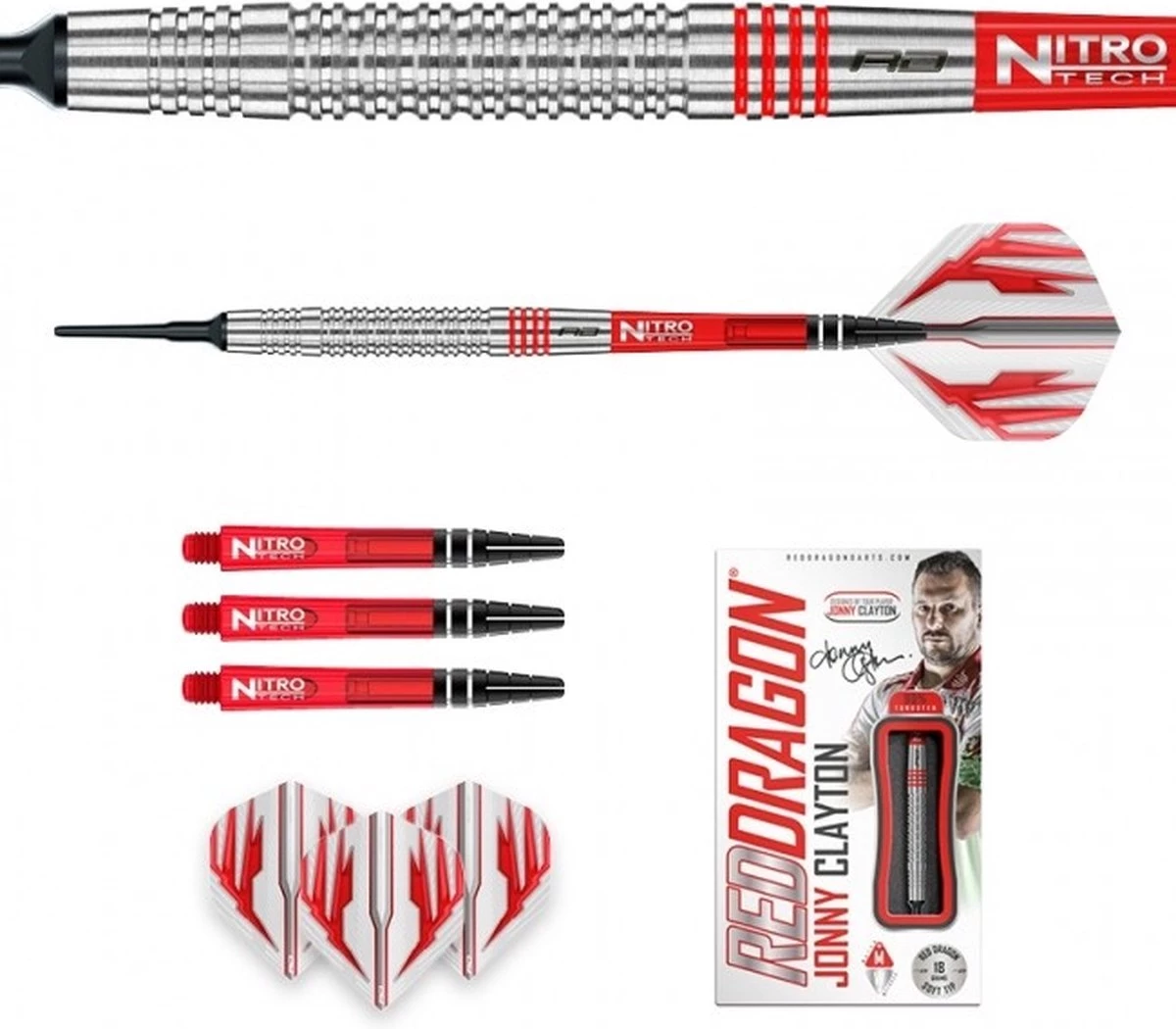 Les fléchettes Jonny Clayton 90% Soft Tip sont livrées en standard avec: 3 vols Red Dragon Hardcore et 3 axes Red Dragon Nitrotech Medium .