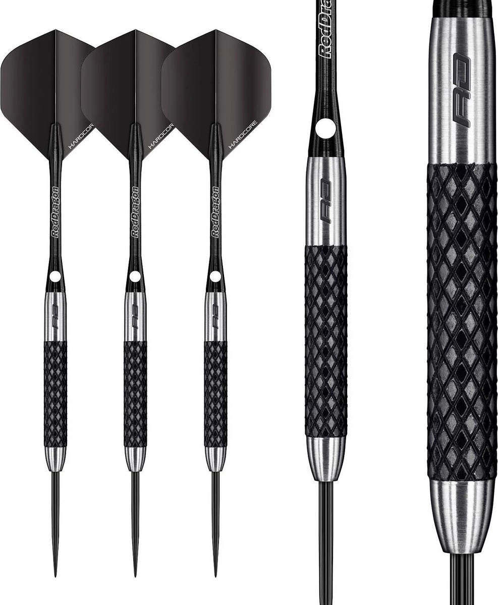 Set de fléchettes professionnelles 32 grammes – 85% de tungstène Steeltip. Set de fléchettes est livré avec des arbres de fléchettes en aluminium. Fléchettes red DRAGON Hardcore Extra épais.La double poignée moletée indépendante offre une meilleure adhérence de niveau 5.