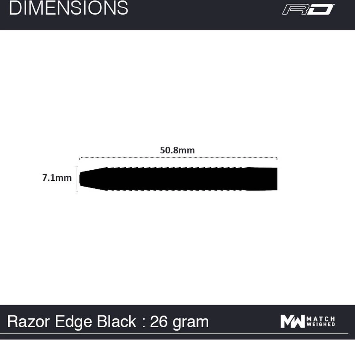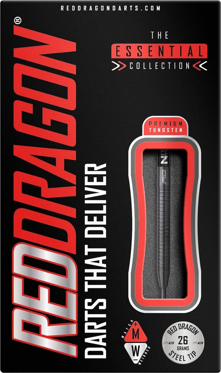 Set de 26 grammes – Fléchettes professionnelles 85% Tungsten Steeltip. Set de fléchettes est livré avec des arbres de fléchettes Nitrotech. Fléchettes red DRAGON Hardcore Extra épais.Superbe revêtement PVD noir avec technologie de prise Razoredge agressive.Les noirs Razor Edge sont également disponibles en poids de 20, 22, 24, 26 ou 28 grammes