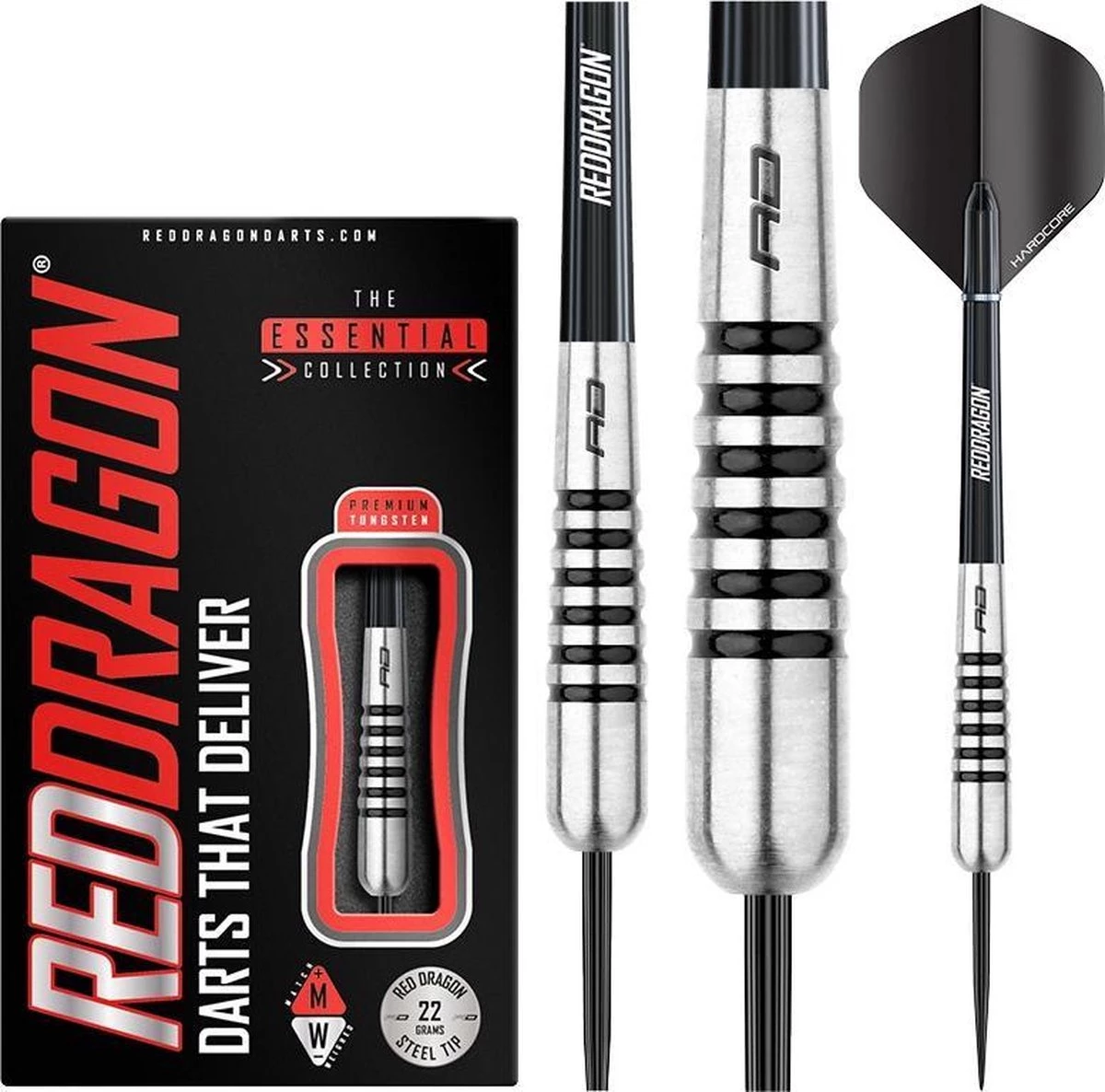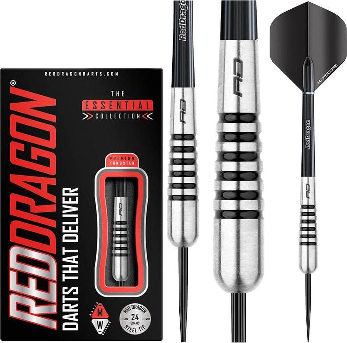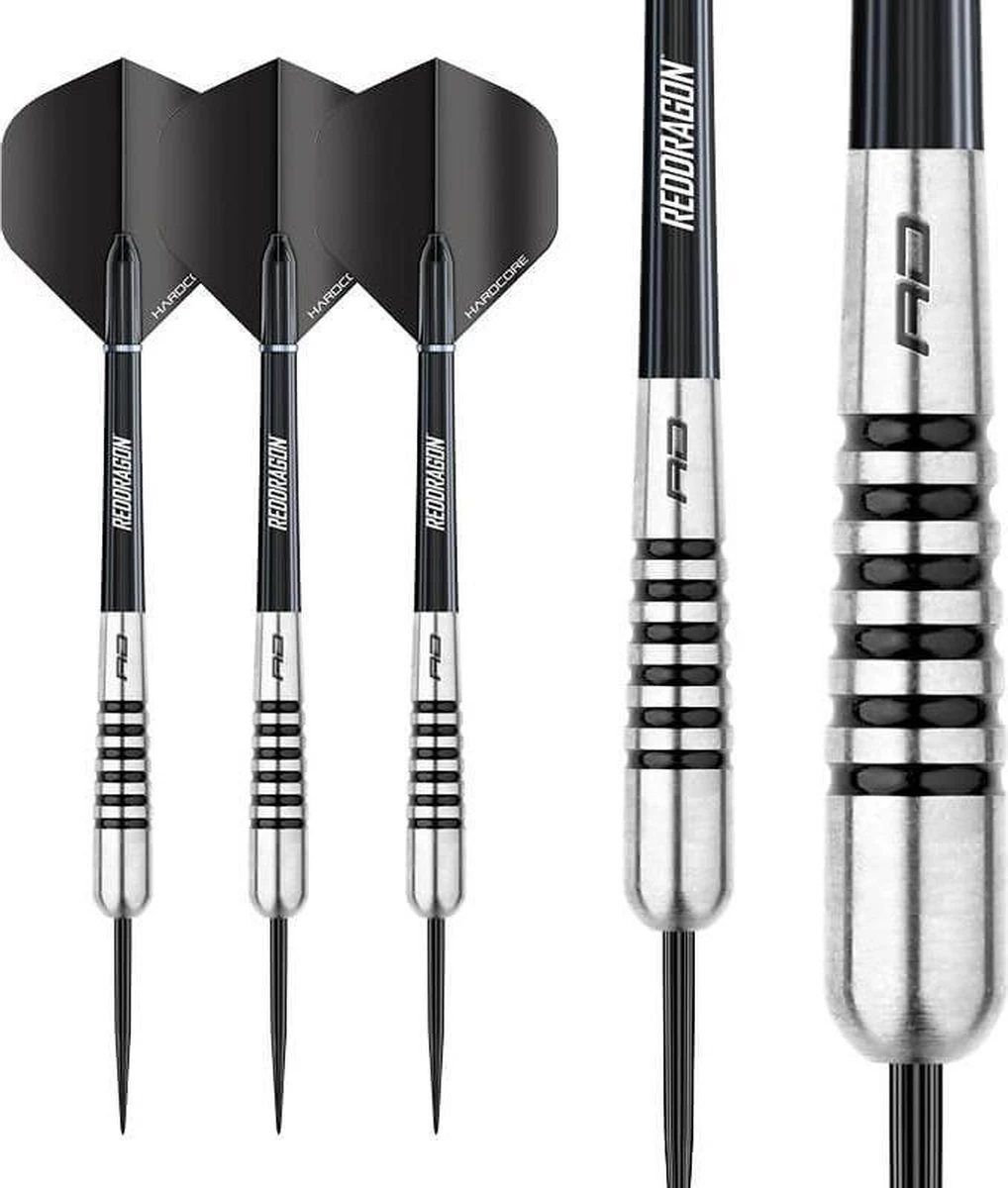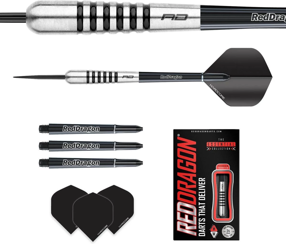 Set 24 grammes – Fléchettes professionnelles 80% Tungsten Steeltip. Set de fléchettes est livré avec des arbres de fléchettes en nylon Ring Grip. Fléchettes red DRAGON Hardcore Extra épais.